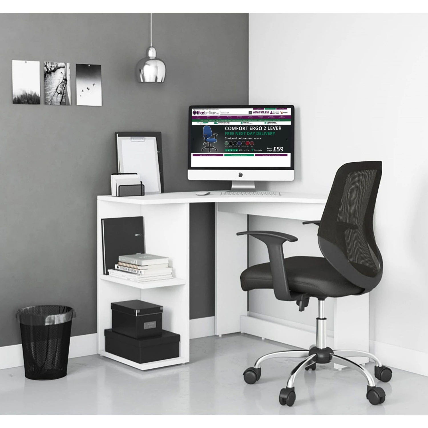 - Panel-end desk features ample side shelving for an ideal storage solution.
