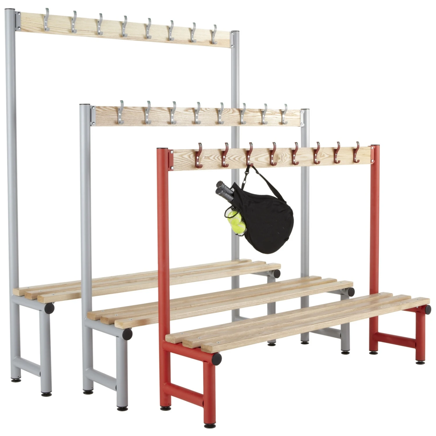 - Freestanding Education cloakroom benches with sturdy, virtually unbreakable polymer coat hooks