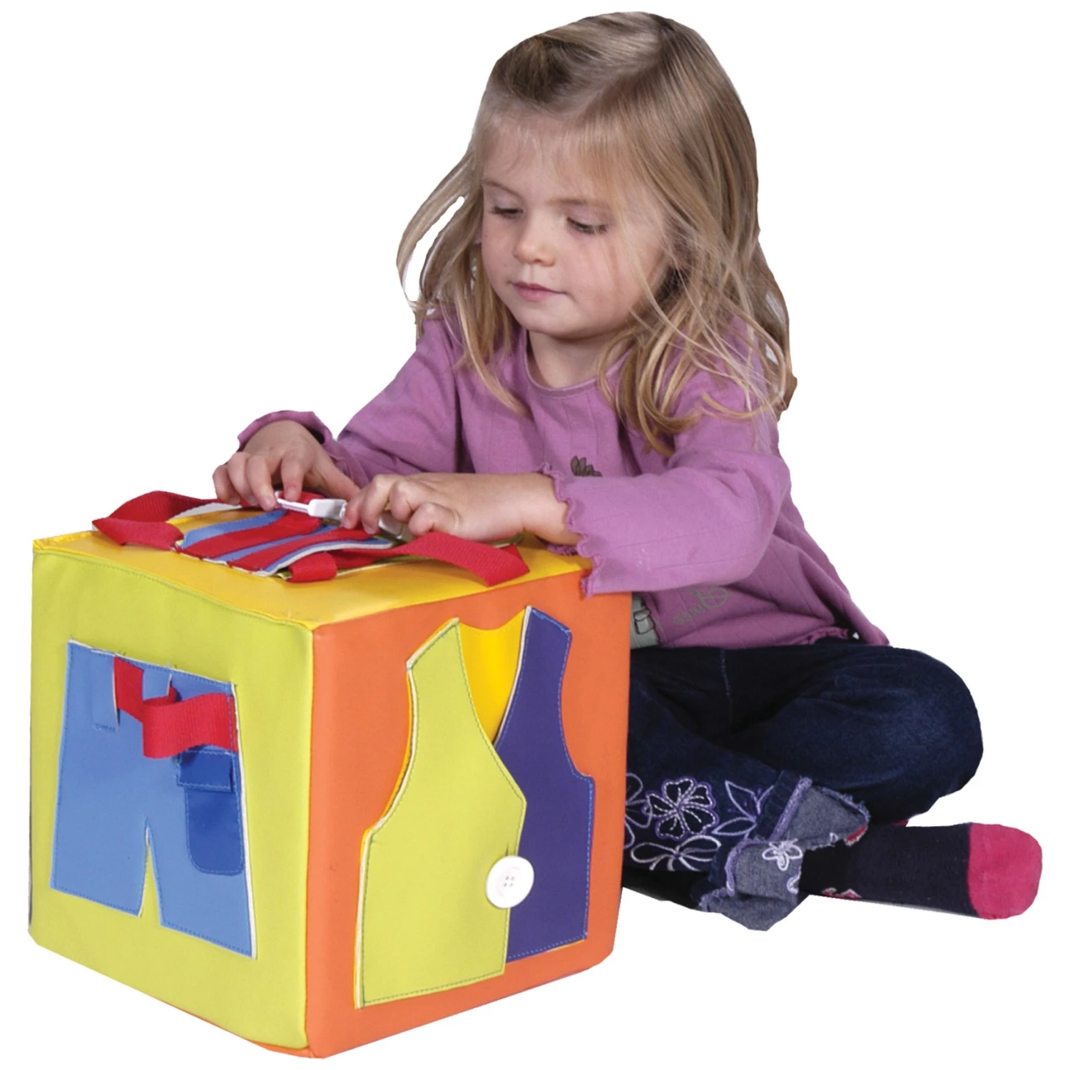 - Fun, brightly coloured and interactive getting dressed cube