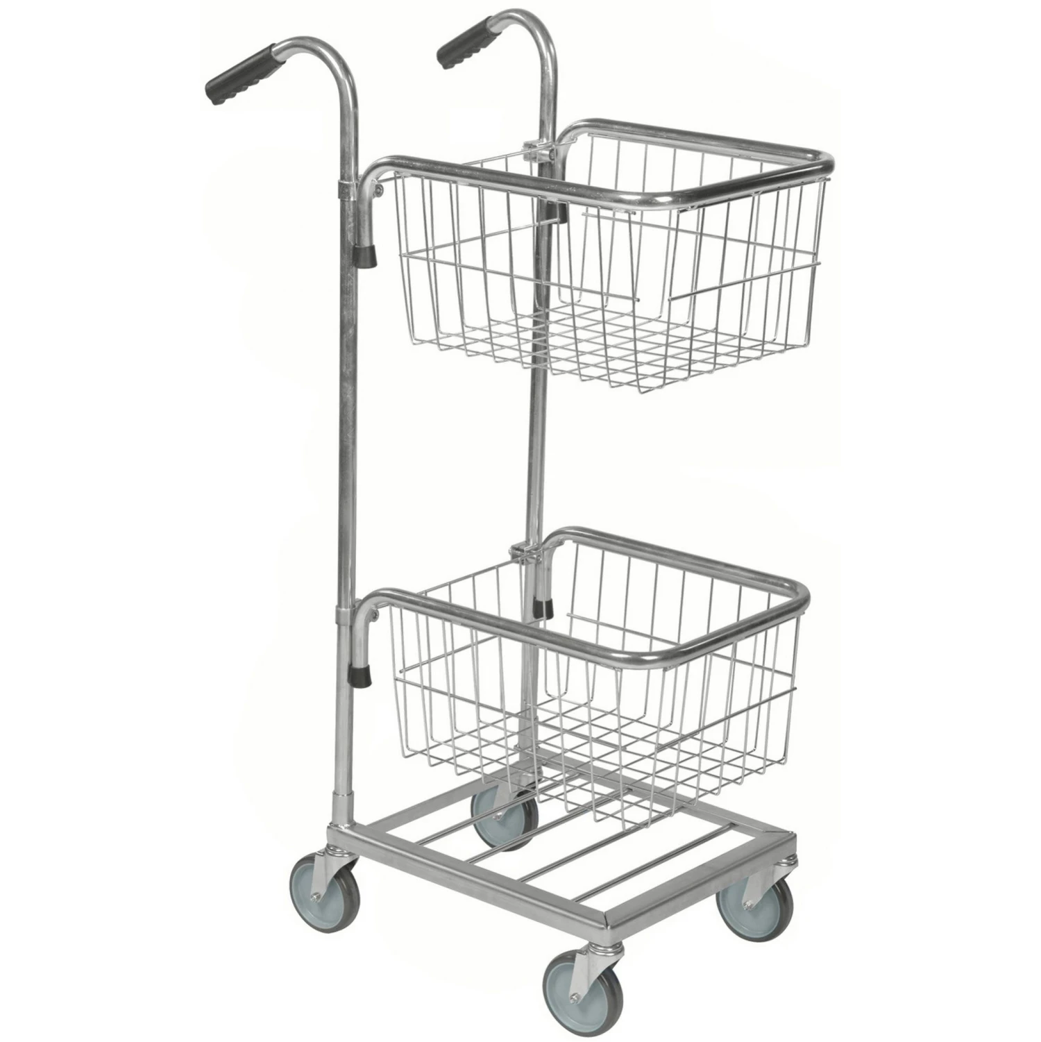Delivering letters and packages made easy with two wire baskets and base platform that can hold boxes therefore making the job more efficient .