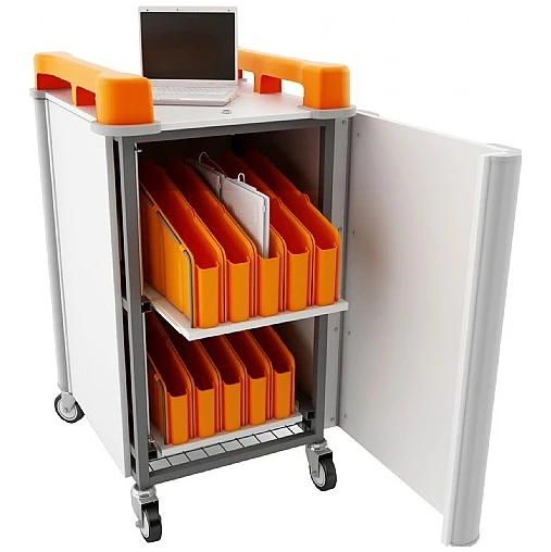 - L shaped doors and pull out shelves provide easy and clear access to laptop storage compartments