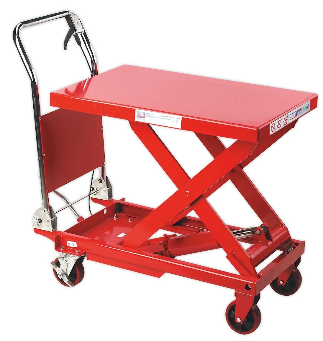 Heavy-duty hydraulic platform trucks from Sealey are perfect for use in industrial environments such as garages and warehouses.