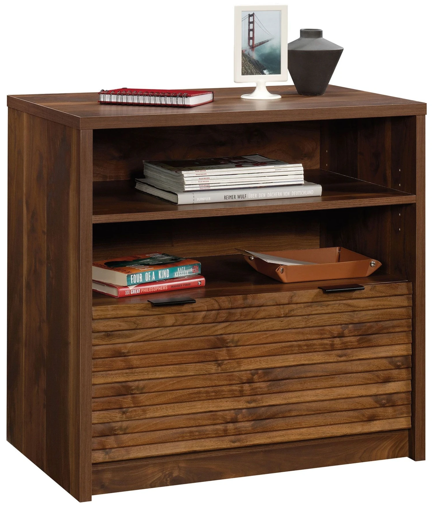 - Open combination side filer in an elegant mid-century style Grand Walnut finish.